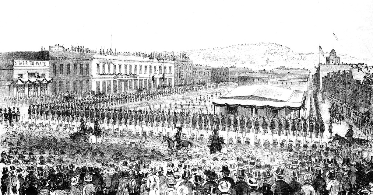Having just been appointed Secretary of the Vigilance Committee and now editor of the Daily Bulletin, Hubert Nobcraft (think "high concept" character somewhere between Cyril Ritchard’s Captain Hook and Alan Rickman’s Snape) suddenly finds himself with unimaginable power. In this song, he searches his conscience, religion and historical precedent to justify using any ploy necessary, including deception, to accomplish what he feels is best for society—and on a more personal note, to destroy his poetic nemesis, the "drunken Catholic," Ned McGowan. One of the more complex sequences in the story, his transformation in this piece from benign volunteer to convicted fascist, begins in St. Mary’s Church and follows him through the bustling downtown and wharf to his arrival at the Daily Bulletin where he is to begin his first day as editor in chief. In the final section here, he imagines himself passing a church cemetery with Ned’s future gravestone marking "Death by Consumption," then rounding the corner to his office, he envisions couples with children along the street awed by his celebrity. (Note: Throughout the score, trills are used to underscore the symbolism of birds in the story. In this piece, however, they are intended as a grotesque mockery.) Performed by Tim Fullerton.